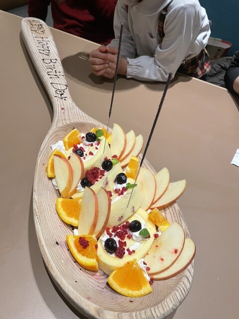 コドモもオトナも盛り上がる「大きなスプーンのアニバーサリープレート」 見たことない〝大きなスプーン〟で誕生日をお祝いしよう。 メッセージと花火と音楽で盛り上げます。 ご予約なしでもご用意できます。お近くのスタッフに申し出ください。