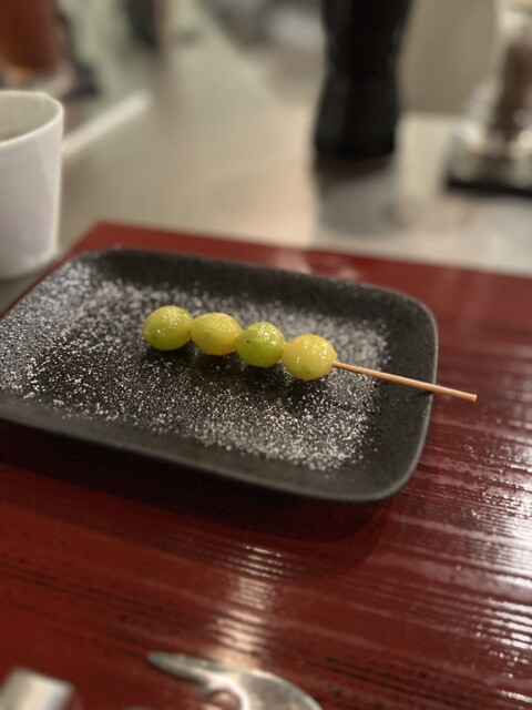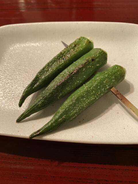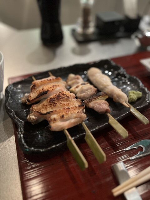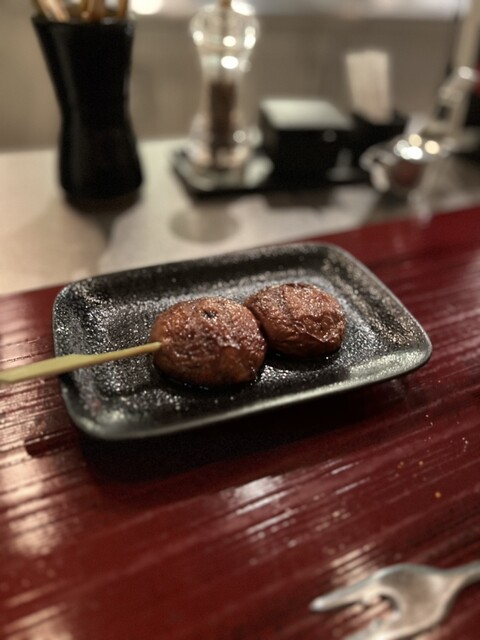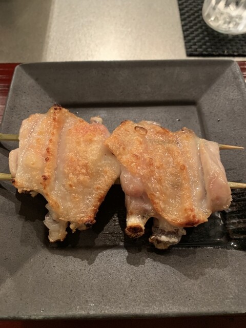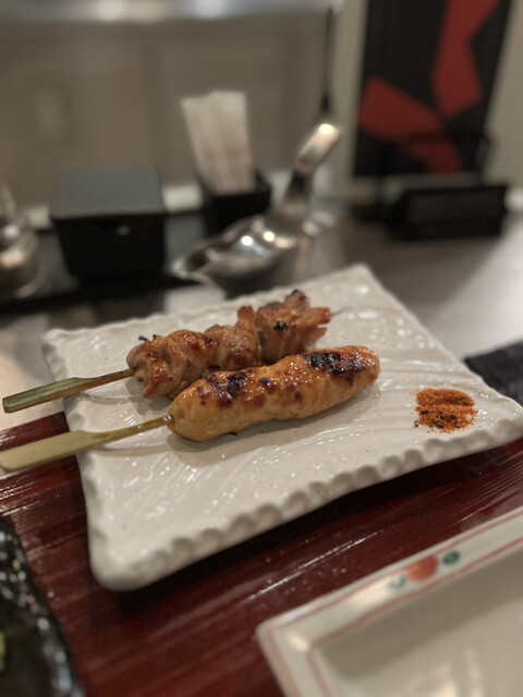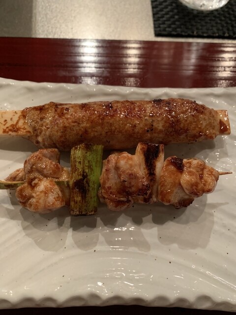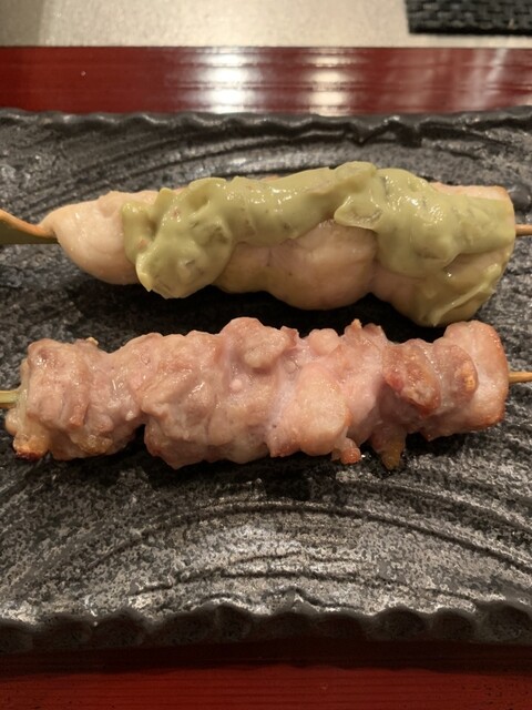 焼き鳥の二串。上の一本はもも肉と思われる定番の一串。程よい脂のりとジューシーさが見事なバランスで、炭の香りを纏った焼き加減も秀逸。表面はカリっと、内部はしっとり柔らかく、噛むたびに肉の旨み...