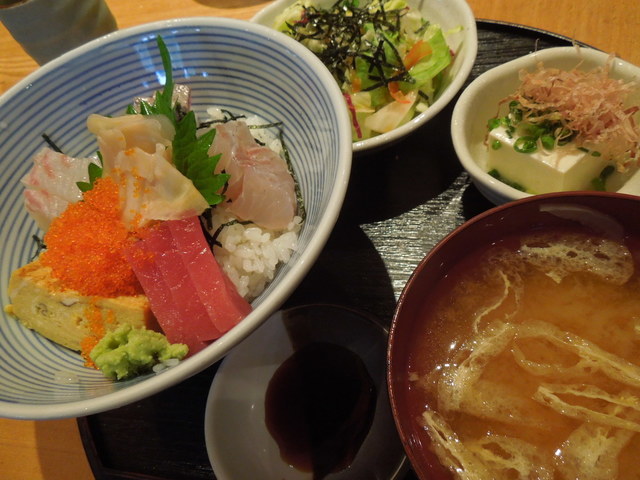 前菜、じゃこ豆腐サラダ、お刺身、魚串、あら煮、にぎり寿司のセットになったコースです。