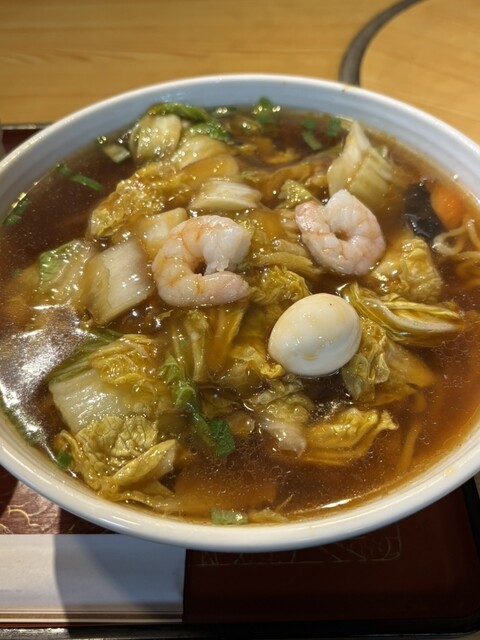 私は、さっぱり塩味を求めて、五目タンメンをオーダーしましたが、塩味ではなく、なんとメニューの写真とも全く異なる醤油ベースの五目タンメンが出てきました。