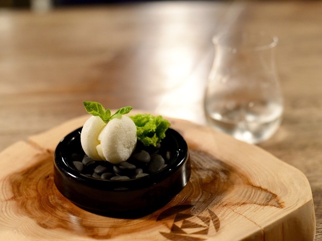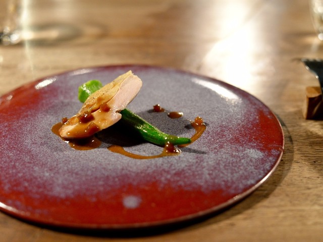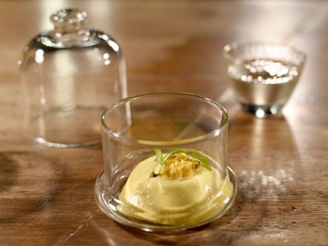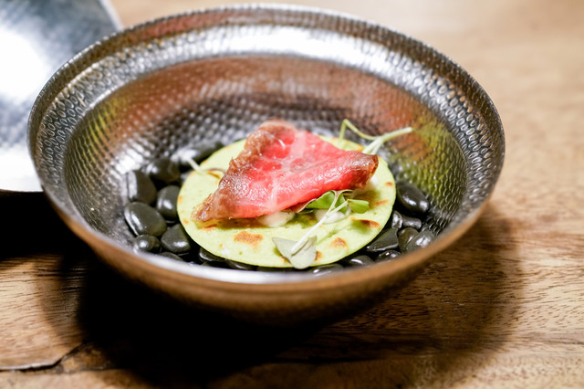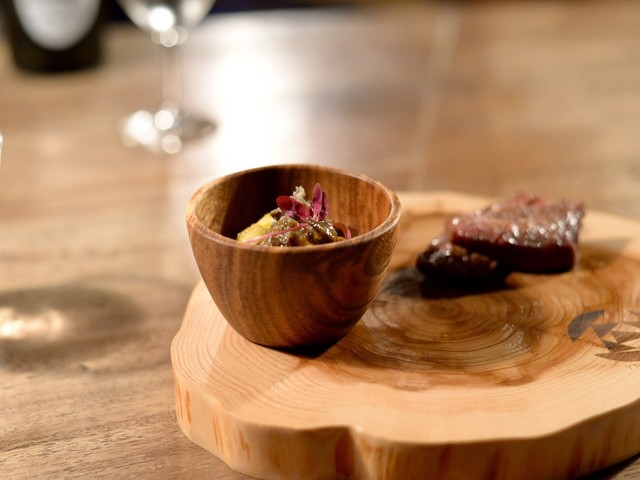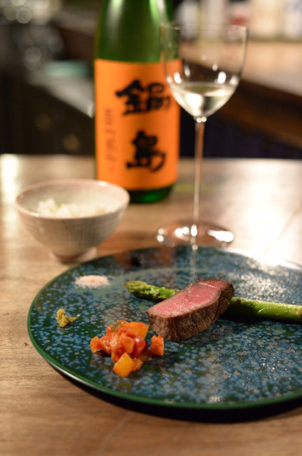 天草黒毛和牛を中心にフレンチ、イタリアンの調理法を用いてお任せコースをご用意。そこに料理に寄り添う日本酒をソムリエがペアリングいたします。