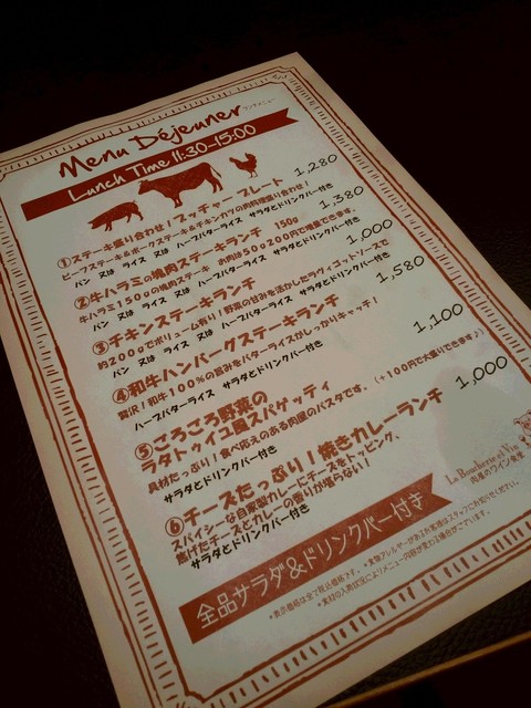 ランチ、ステーキ盛り合わせランチ“ブッチャープレ-ト、牛ハラミの塊肉ステーキランチ、ハーブチキンステーキランチ、和牛ハンバーグランチ、ごろごろ野菜とベーコンのラタトゥイユ風スパゲッティ、チーズたっぷり焼きカレーランチ等。ダイナック系得意のドリンクバー・サラダ付。