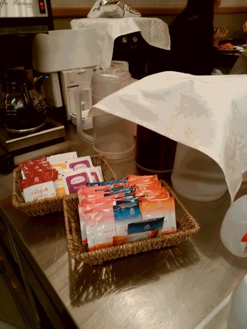 充実したドリンクバー。冷たいドリンク、アイスティー、アイスコーヒー、ウーロン茶、レモン入り炭酸水。ホットはコーヒー、テイバッグ多種。