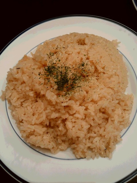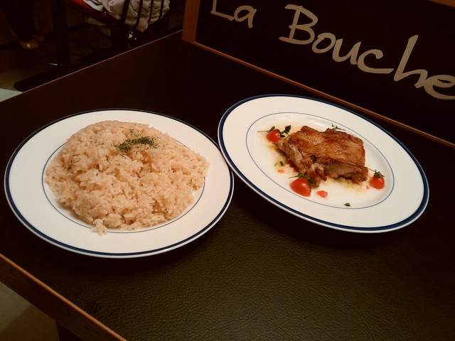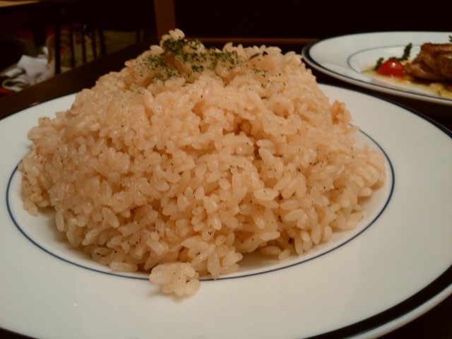 大盛りいえ特盛できるかしら、なんて希望をしたものの。本当にお皿いっぱい「特大大盛り」。感謝しつつ、いただきます。バターとハーブの爽やかな香りが広がります。粒が大きめでしっとりとモチ米のような食感。炊き込みピラフなのか、こってりしすぎず、これだけでも充分おいしい。