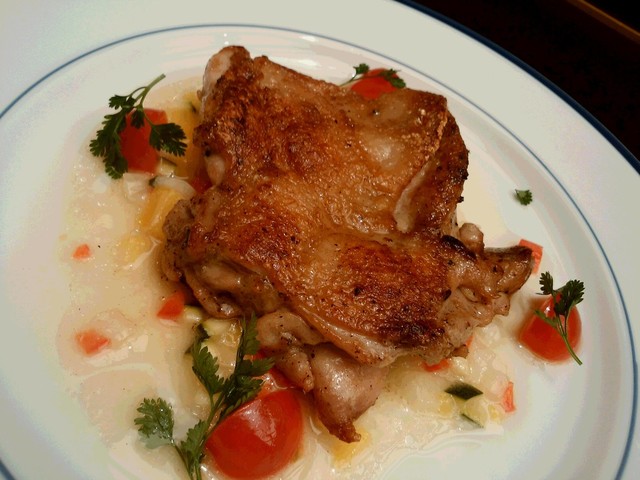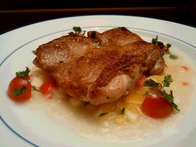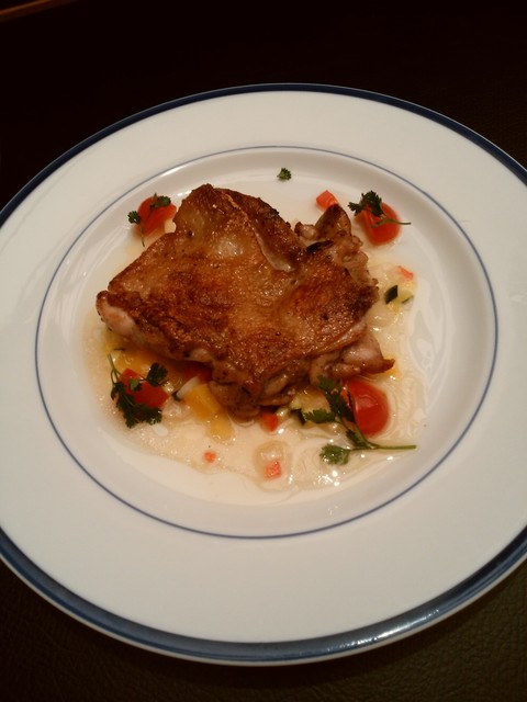 ソースは、色鮮やかなラビゴットソース。ラビゴット、「元気を出させる」「回復させる」の意味。ほんのりすっぱいソースは絶妙な焼き加減の鶏、脂分に調和、よくあいます。