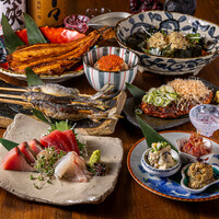 【2.5時間飲み放題付き】炉端焼きや鮮魚のお刺身、こだわりの逸品料理も付いた豪華9品コース。前菜三種盛り合わせから、豆腐と揚げじゃこのサラダに始まり、厳選した鮮魚刺身五種盛り合わせ、さつまあげ炙り、メインの炉端焼は紀州鮎、伴助きんき開きを含む3種類が味わえます。生ビールや日本酒を含む豊富なドリンクも魅力♪宴会にオススメです!