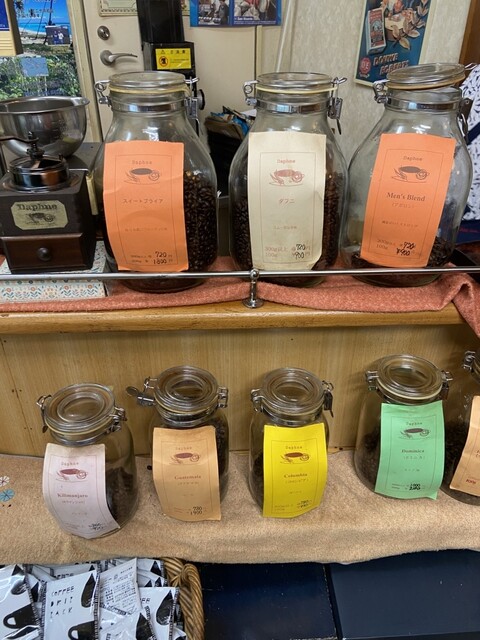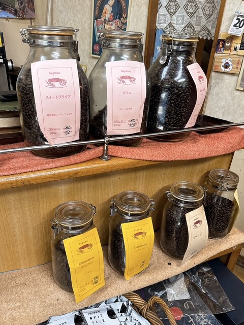 ◼️大阪で珈琲の神様と知られた故襟立氏の弟子のご婦人が営む。巨大焙煎機での自家焙煎深煎りブレンド「ダフネ」が人気。店内数席程で豆販売がメイン。(全席喫煙可)