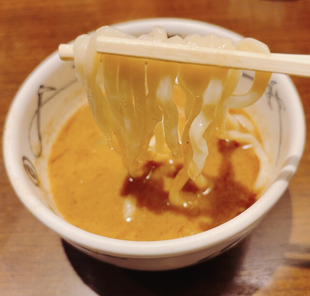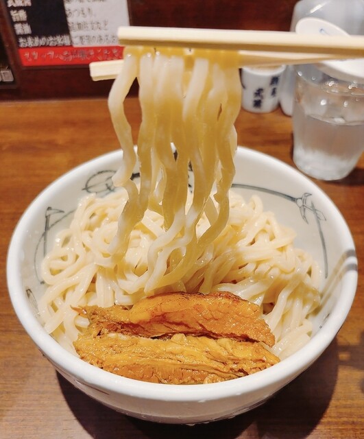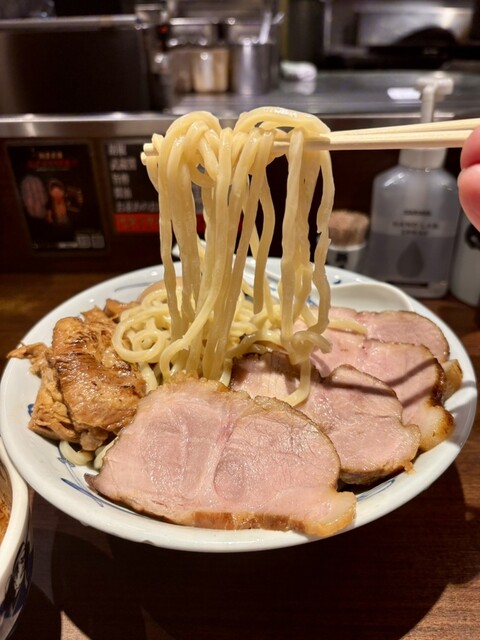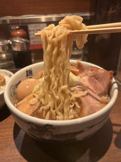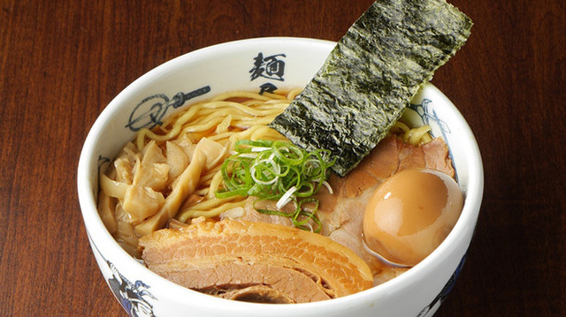鶏ガラと豚骨を主体とした「動物系スープ」と、かつお節、煮干しでとる「魚介系スープ」の二刀流スープ。バランスの取れた深い味わいのスープに、小麦の香り・甘味を感じるモチモチ中太麺がよく絡みます。