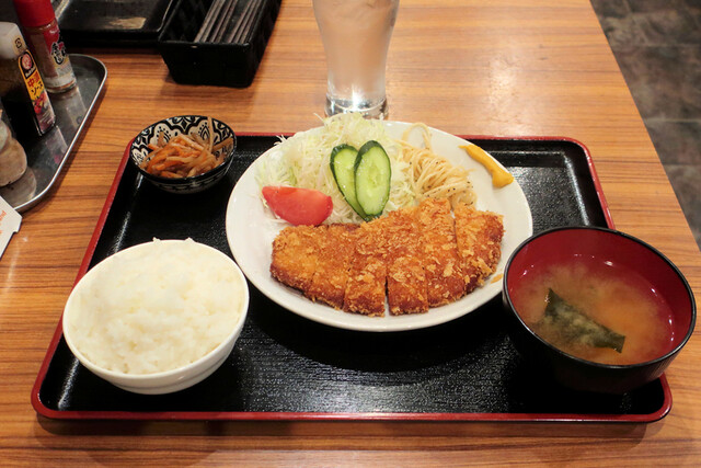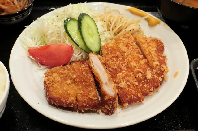 店頭に置かれている立て看板で、とんかつがあることを知ります。