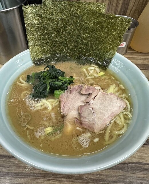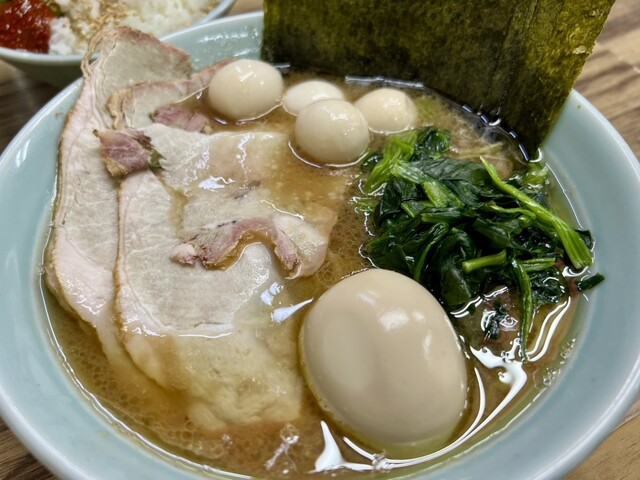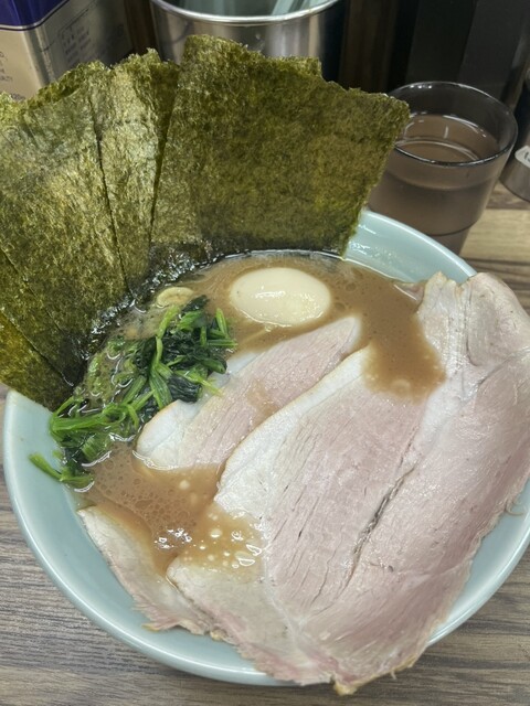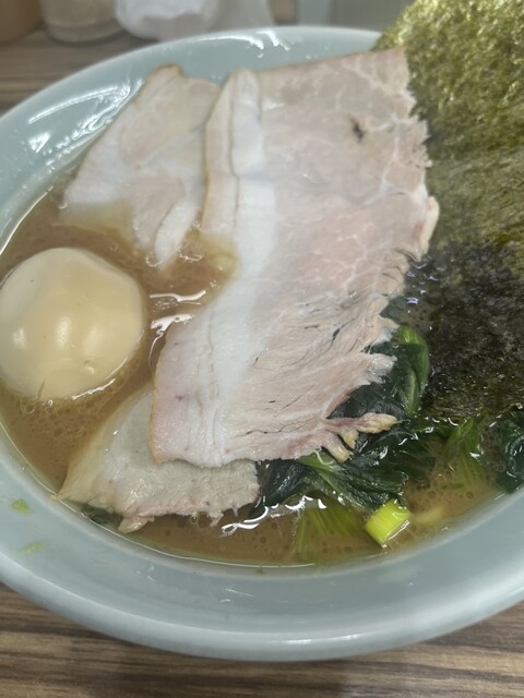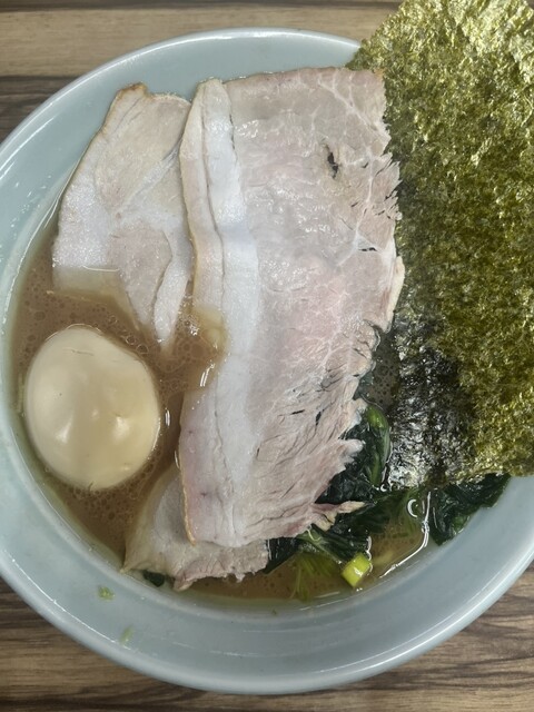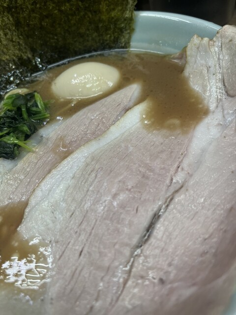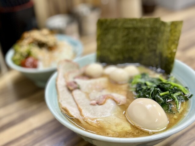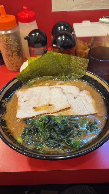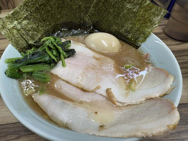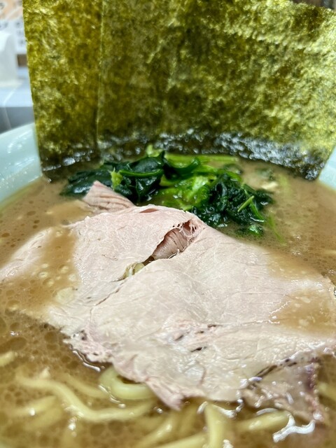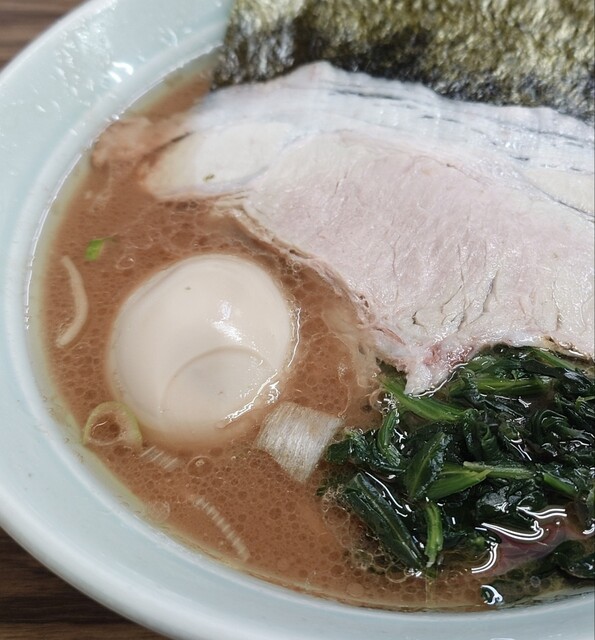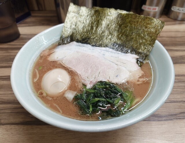 着丼すると、家系らしい濃いめの豚骨醤油スープに、チャーシュー、味玉、海苔、ほうれん草と定番トッピングがしっかり揃う。