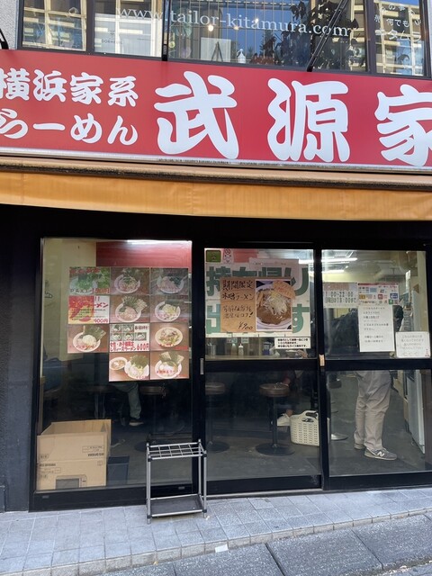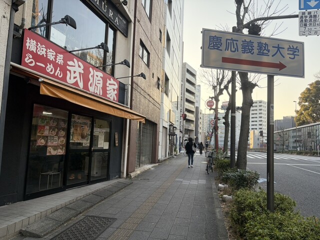 田町〜三田エリアにある「横浜家系らーめん 武源家」へ。ランチ時や仕事帰りにふらっと立ち寄りやすい立地。すぐ側には有名な三田二郎の行列が。。