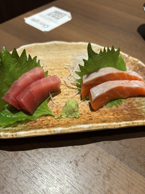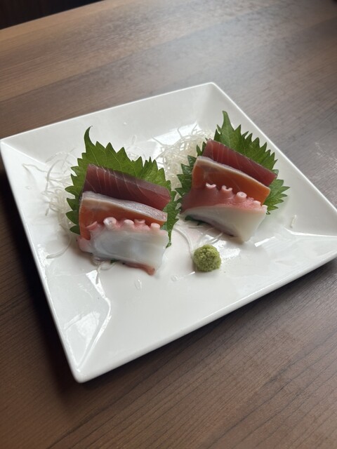 お刺身5点盛りはサーモン、まぐろ、たい、エビ、たこでした。