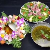 しながわ畑名物のオイルしゃぶしゃぶか麻辣花火しゃぶしゃぶを楽しめるコースです! 佐賀牛のなめろう・オリジナルしゃぶしゃぶ・天ぷら・大山鶏の蒸篭蒸しなど全8品! 個室でこだわりの和牛と旬野菜、自慢の蕎麦お楽しみください! 飲み放題は生ビール付きの2.5時間制(LO30分前)です! ※金曜日は2時間制のご案内となります。