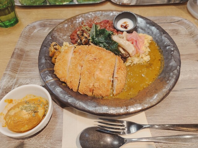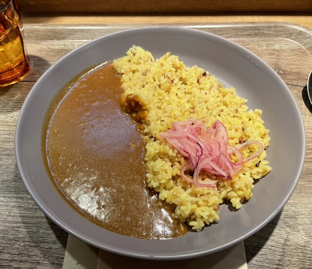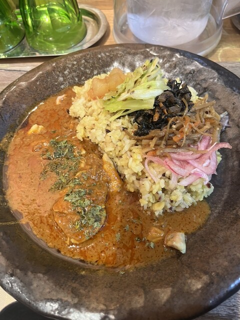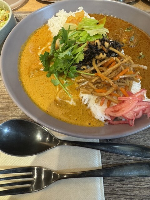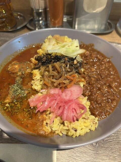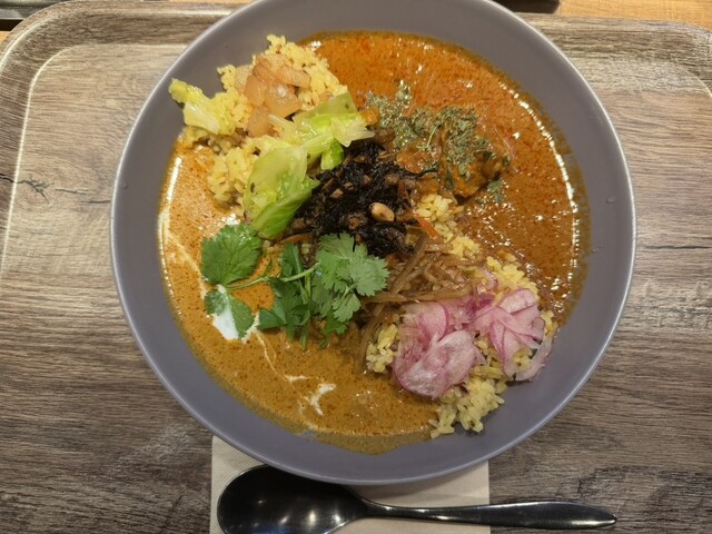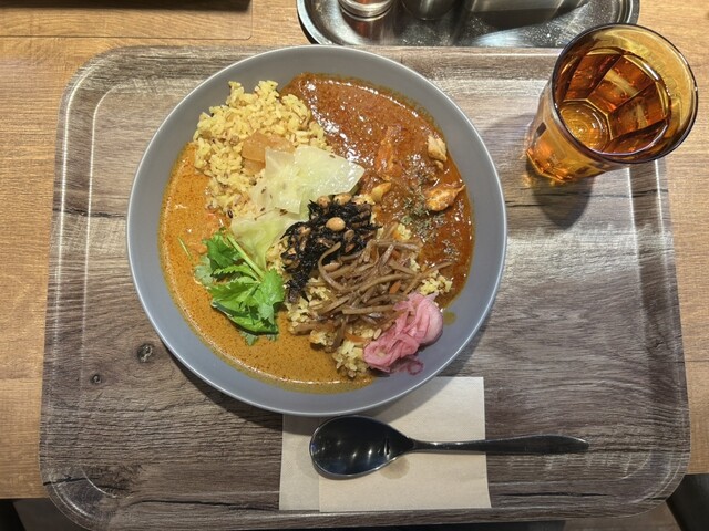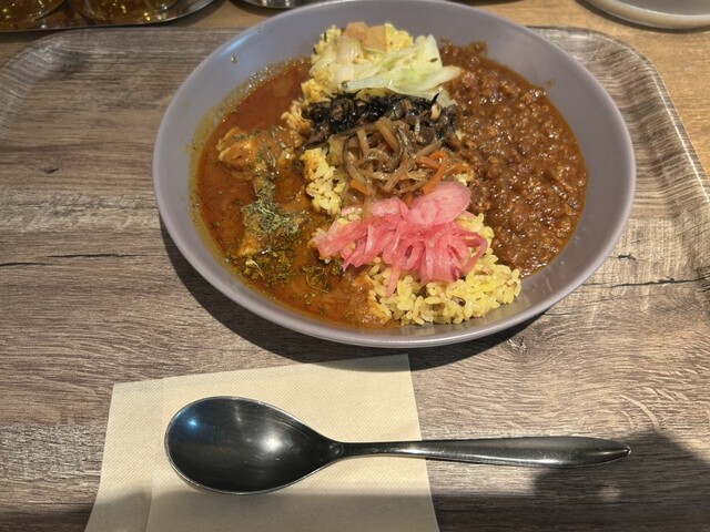 海老とココナッツのアジアンカレーとチキンの合盛りカレーをいただきました。 海老カレーはココナッツのまろやかさと海老の旨みがしっかり感じられ、チキンカレーはスパイスが効いてコクがあります。 ご飯の上にはカレーの味を引き立てるお惣菜も添えられていて、スパイシーな香りと彩りが楽しめるのも嬉しかったです... 詳細を見る