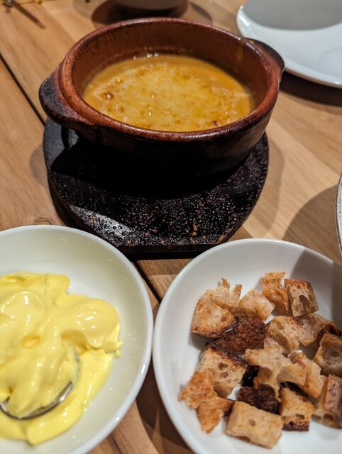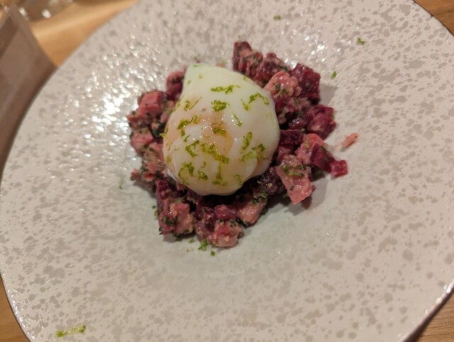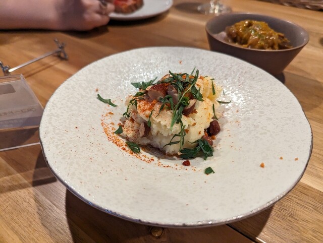 ビールが好きな友人を誘って初訪問。ゴルフのシミュレーターとか、クラフトビールの量り売りとか、そもそも半地下とか、普通の店とはだいぶ一線を画しているけど、私はゴルフもやらんし、たいして飲めないし、景色とか別に気にしない、要はただの食いしん坊なので、お料理が肝心なわけ。