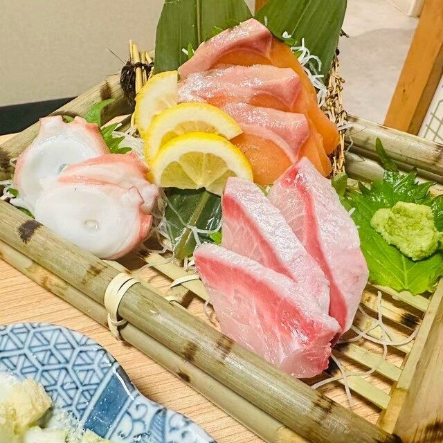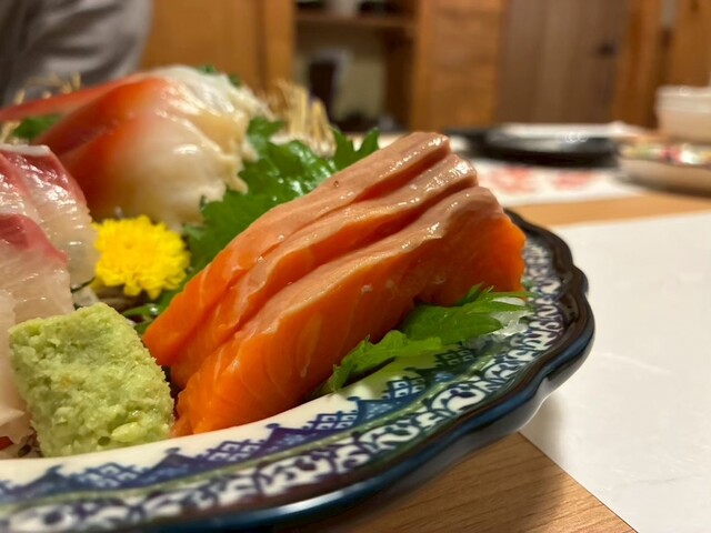 まず頼んだお刺身盛り合わせがもう反則級。ぶり・サーモン・タコが分厚い!プリップリの脂が舌の上でとろけて「あ、もう帰れない…ここに住む…」って本気で思いました。特にブリの脂の甘さは優勝レベル。わさびと一緒に食べると神の食べ物に昇格します。