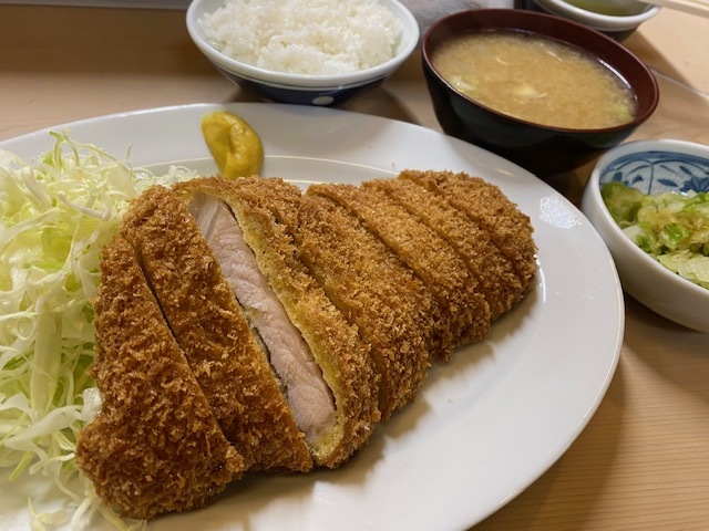 ソースをかけてご飯加速。豚汁は具が大きくてたくさん。キャベツはお代わり一回、ご飯は二回まで。今回はご飯のお代わり...