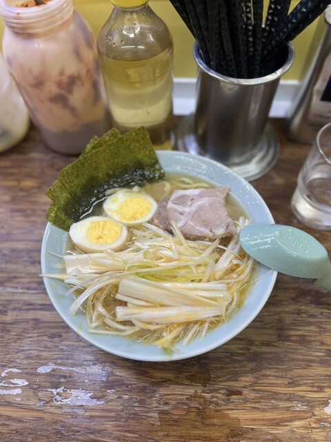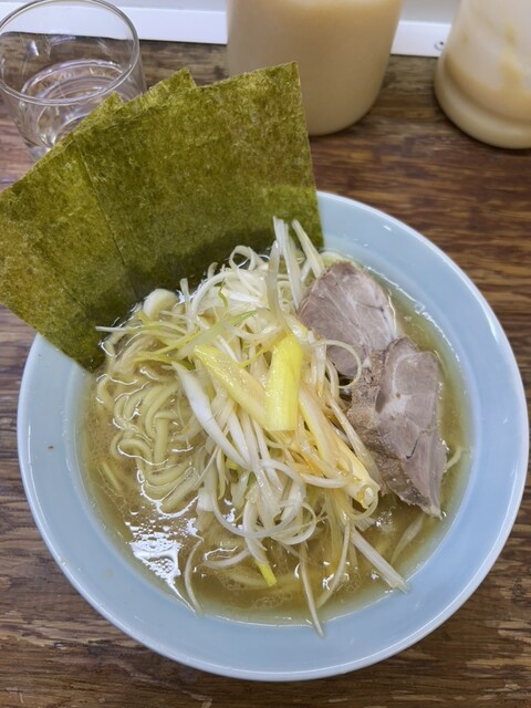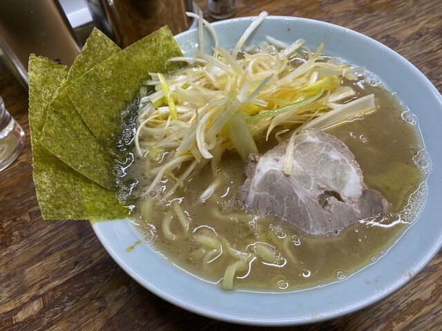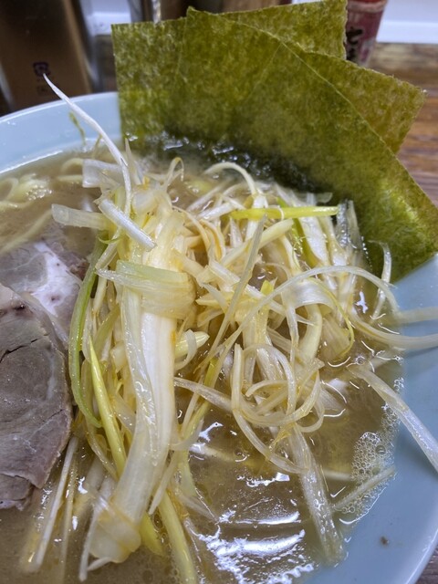 青物横丁のまこと家。黄色い看板が目印。朝からやっとるんやね。ネギチャーシュー1500円。強気の値段やけど、この山盛りのネギ見たら納得。ライスと茎わかめも必須やん。スープは家系の中でもかなりワイルド。醤...