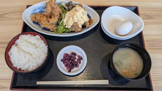 テーブルでQRコードを読み込みスマホで注文するスタイル。ランチはいくつか定食があるが、唐揚げとチキン南蛮の合盛り定食にした。