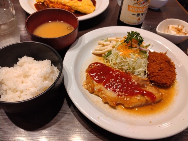 ポークソテーガーリック風味&コロッケ定食1100 一番搾り中650 娘は ランチオムライスデミグラスソース900 海老フライ450 1330過ぎに店内いっぱい ... 詳細を見る