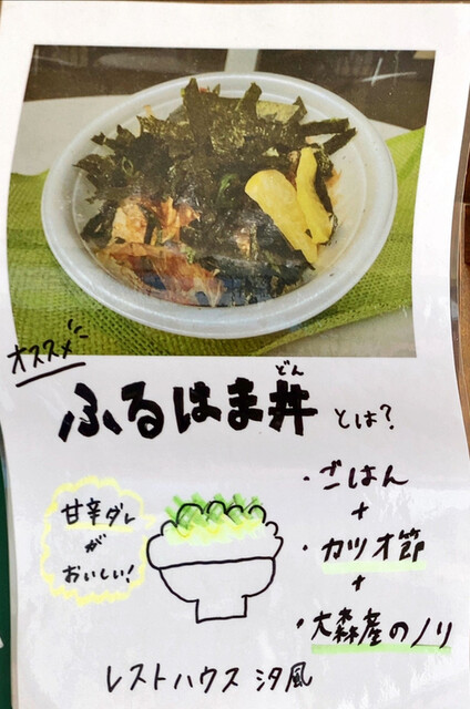 ふるはま丼は、ご飯の上に大森産海苔、鰹節をかけたもので、オススメメニューとなっている