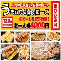 人気の鉄板焼きと自慢の粉もんを人数に合わせてご提供! 120分飲み放題付き!生ビールも飲み放題メニューに込みです! もんじゃ・お好み焼き・焼きそばはメニューからお選びください!