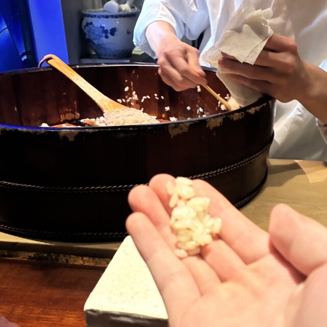 シャリを炊き立てで目の前で赤酢と合わせます。そのあと、とびきりのネタと合わせて15巻の圧巻コース...