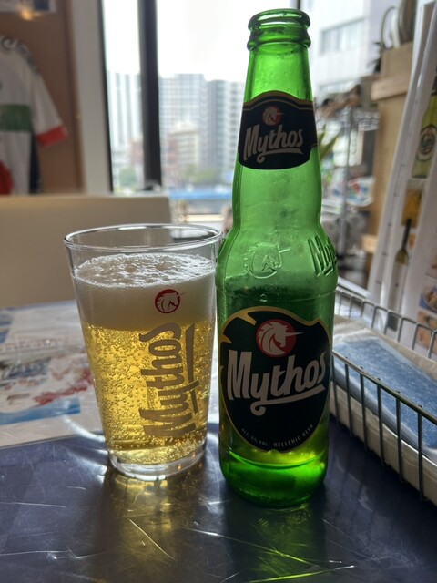 テーブル席に腰かけてメニューを手に取り、ミソスビールに、定番だと思う ” サガナキ ” と ” ムサカ ” を注文。