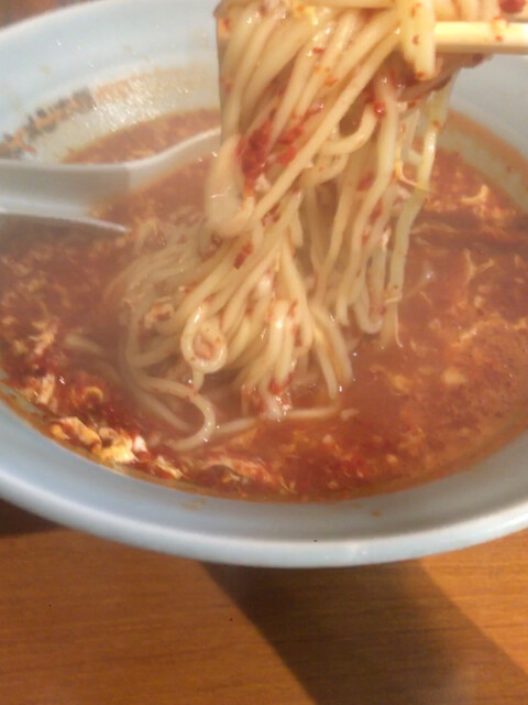 2013年11月。 ずっと前からブックマークしていたこちらのお店にやっと訪問。 午後1時半近く、時間のせいか店内は空いていた。 私は、タンタンメン@700を、メチャ辛で注文。 辛さは、控えめ→普通→中辛→大辛→メチャ辛の順で選べる。 夫は、Bセット(タンタンメン+餃子)@900を注文。 タン... 続きを読む»