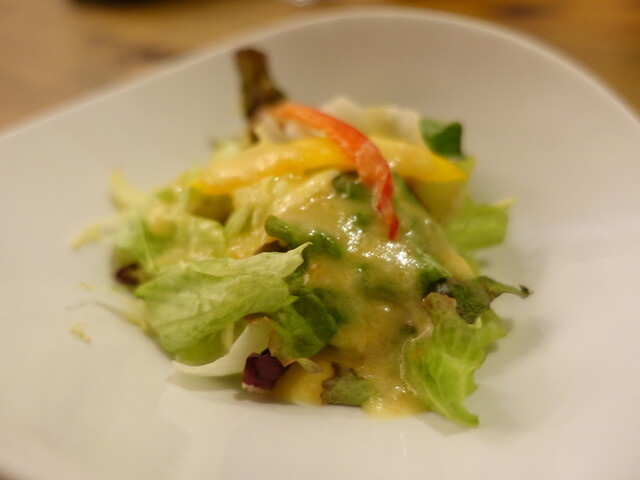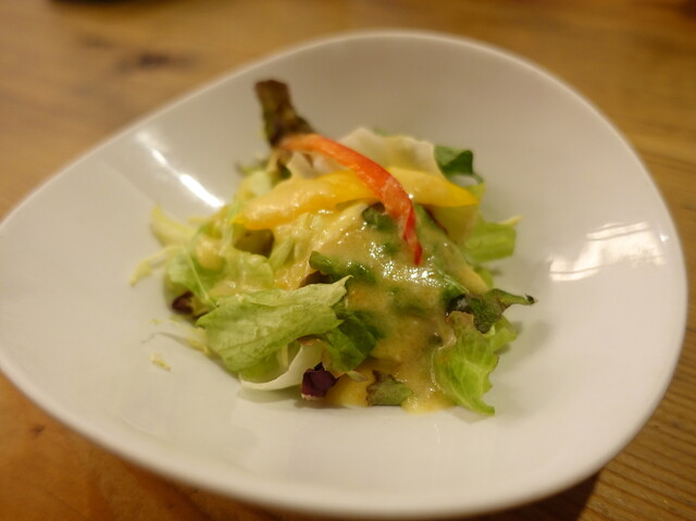 サラダが出てきます。酸味の効いた玉ネギドレッシングぽいのがかかっています。黒胡椒を振って食べると美味しいですね。