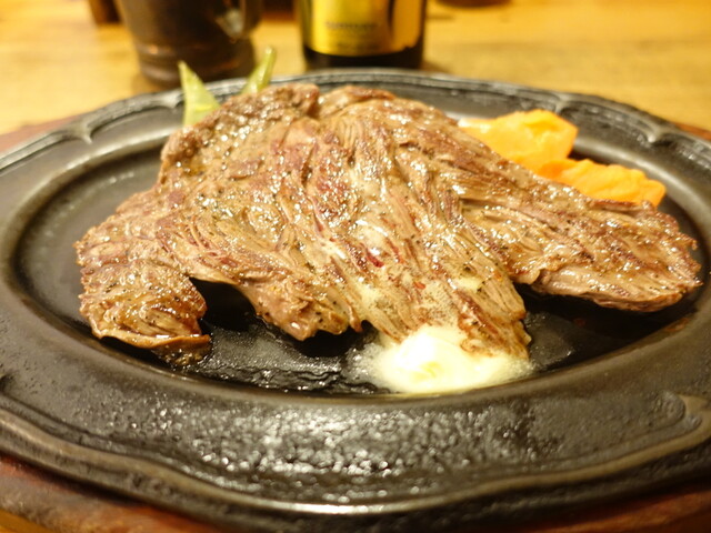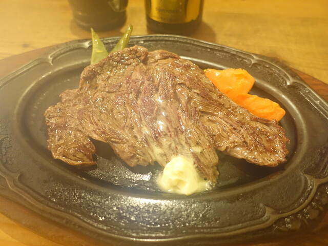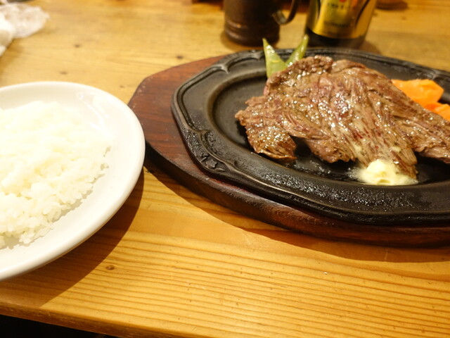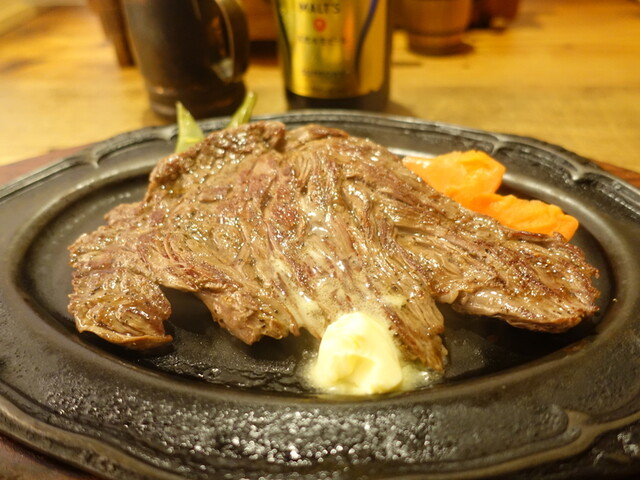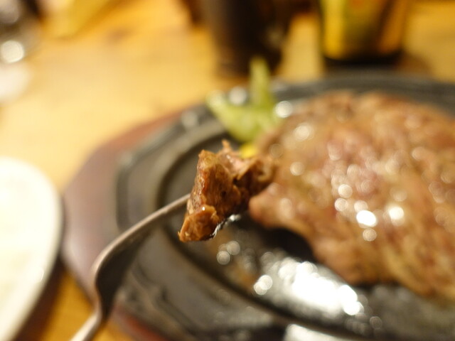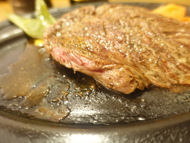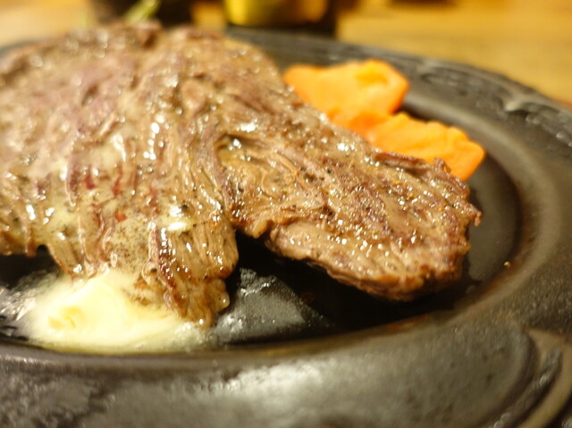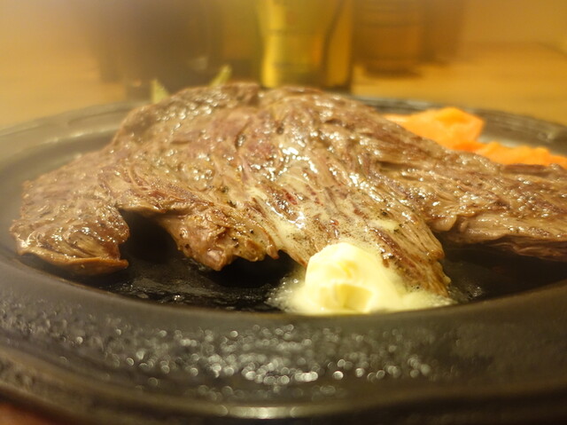 意外と早く5分ほどでステーキ登場。鉄板の上で200gのお肉がジュージュー湯気を上げています。開いてあるもも肉にバターが溶けて流れて。ナイフはすっと入り、食べてみると割と柔らかで美味い。ヒレほど柔らかくはないけど、十分食べられる歯応えです。焼き方はミディアムレアで頼んだのが正解。中はピンク色だけどちょうど良い焼き加減。ももは焼き過ぎない方が固くならず美味しい。付け合わせの野菜は人参と鞘いんげんでした。