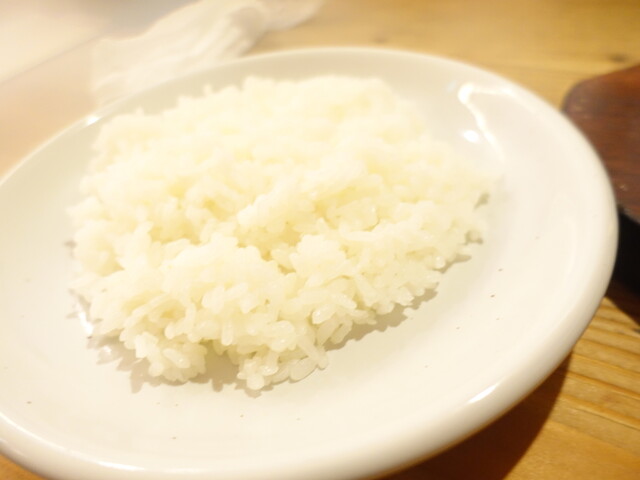 お皿に載ったライスは、まあまあの炊き加減で合格。ランチタイムはおかわりできるそうで、店員さんがおかわりお持ちしますか、と聞いてくれたのでお願いしました。