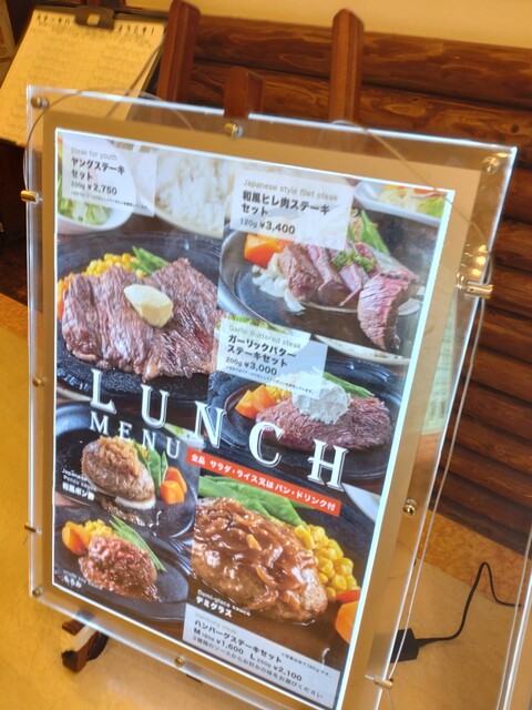 ランチのステーキは2700円~5000円くらいで部位によって値段が違います。廉価版のヤングステーキをチョイスしてみました。もも肉200gのお手軽ステーキです。割とお客さんの年齢層は高めで、ステーキやハンバーグを注文している人が多かったですね。
