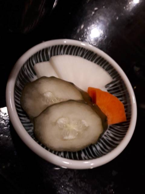 漬物は大根、人参、きゅうりのぬか漬けで、ちょっぴり古漬け具合でちょうど良かったです。