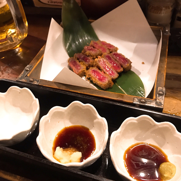 当店では多彩な居酒屋メニューをリーズナブルにお楽しみいただけます!一押しはサシの入ったロース肉をミディアムレアに仕上げた「極上ビーフとろかつ」。お好みに合わせてワサビ醤油・ニンニク醤油・岩塩をつけてお楽しみいただけます♪また、各種宴会にぴったりなコースや飲み放題プランもご用意!こだわりの「凍結丸ごとレモンサワー」と一緒にいかがでしょうか◎店内は14名様より貸切が可能。団体様のご宴会も対応可能です!