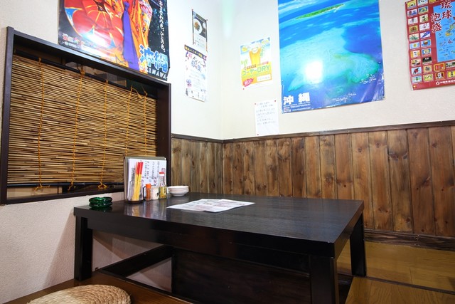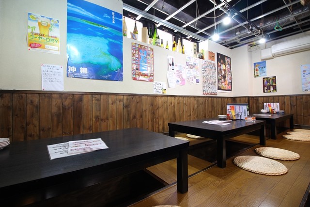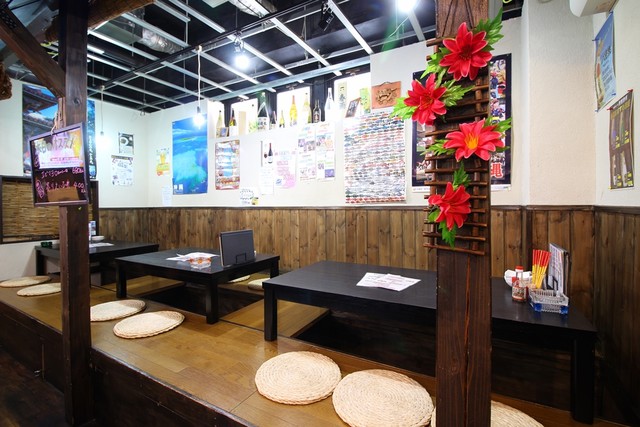 沖縄気分が味わえる明るい店内は三線ライブの小さなステージもあり!月に3、4回ライブをみながらお酒もお楽しみいただけます。