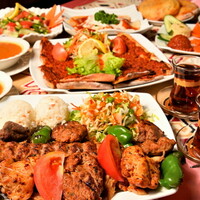 2名様から ボリームたっぷりコースです。トルコ白チーズ入り春巻き、鶏肉ソテーはあつあつのプレートです。いろんなケバブが味わえます。