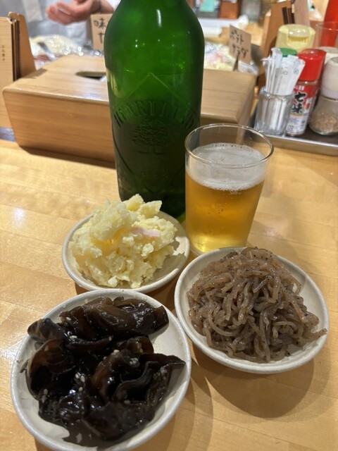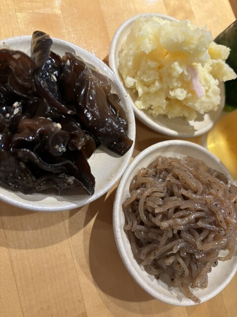 鶏の唐揚げと小皿に盛られる一品料理が美味しいお店でございます