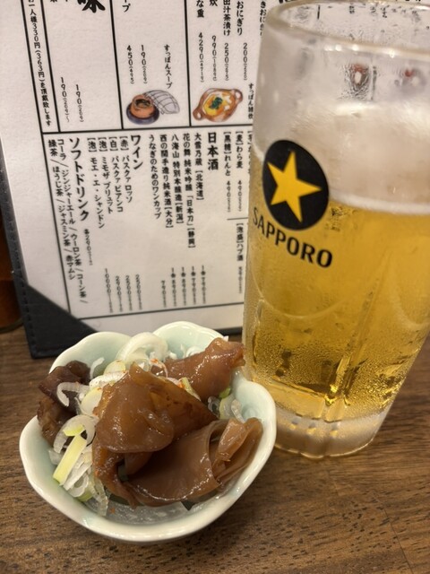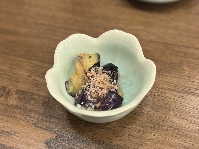 最初に登場したのは、お通し。シンプルながらも 職人の心遣いを感じる一品。程よい塩味と旨みが、これからの料理への期待をそっと膨らませる。