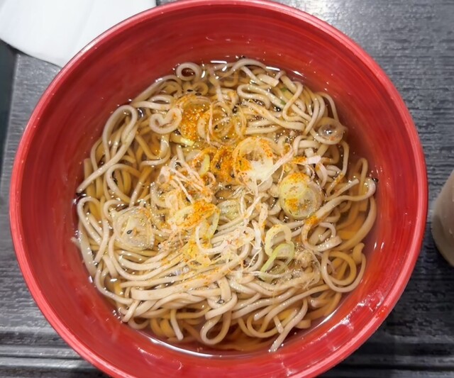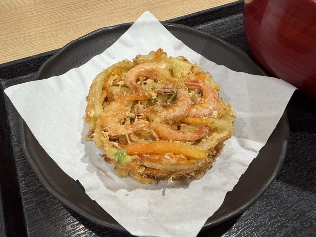 冷たいつゆに麺の幅が不揃いな蕎麦が入り、かき揚げ天と刻みネギが乗っています。器の...