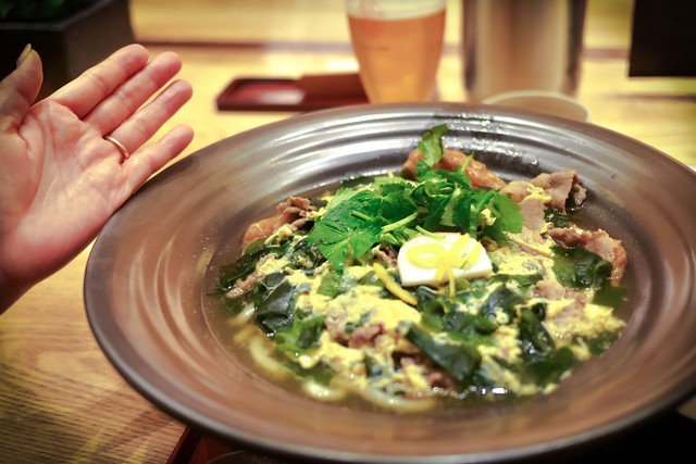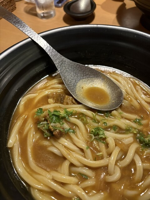 【2015年 8月再訪問】 この日も早朝のフライトで、レギュラー メニューの中から牛しぐれ南蛮のおうどん 1,350円をオーダー。 供されたおうどんの中央にはかつお節が 掛けられたかき氷の山がそびえ立っている が、氷山の一角とは意味合いが違う。 このおうどんは、ねぎの香りと牛肉の旨さが 際立つ旨みを備えているが、温かい牛しぐれ を氷でキンキンに冷えたおうどんに投入する ... 詳細を見る