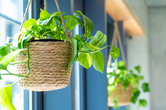 コンクリート打ちっぱなしの壁と白壁のコントラストに、緑の装飾が映え、ダークブラウンの家具が全体を引き締めます。