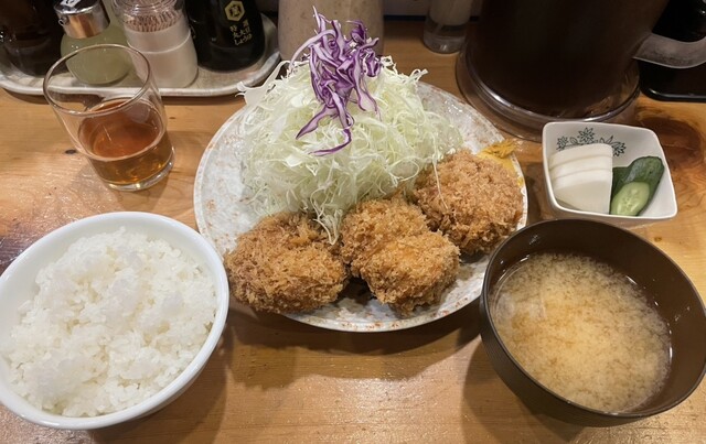 (ヒレかつの大きな塊が3つで、2つに切られて、6切れ。大盛りキャベツ、ごはん、しじみのみそ汁、香の物2種(たくあん、きゅうり))
