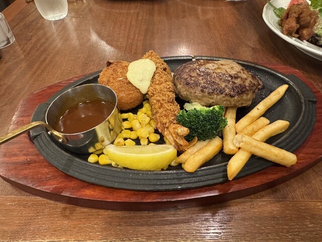 • ロイヤルホスト - アジア姉さんがサーブ。普通に写真撮ったら天地逆さまじゃん(笑)編集で逆さにしたら、やっぱ遠近法で変な感じ。諦めてそのまま載せました。ハンバーグ、エビフライ、カニクリームコロッケ。