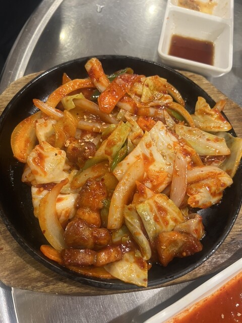 野菜いっぱいのサムギョプサルの豚肉を辛めに炒めたものだった