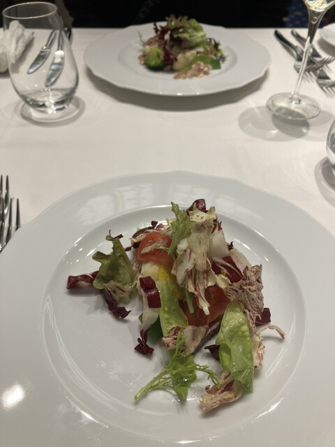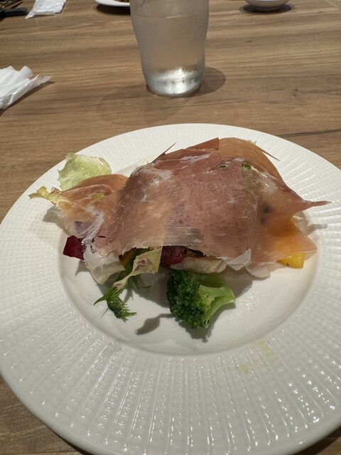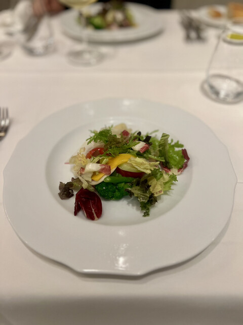 生ハムとサラダの前菜からはじまり、バゲット、パスタ、ドルチェをいただきました。