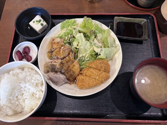 鶏肉は柔らかくちょっと甘めので女性の好きそう味付けで、マスタードのツブツブが良いアクセントで美味。海老カツも少しすり潰し気味の海老でしたがカラッと揚がった衣と柔らかい海老の食感が丁度良い感じ!おしんこと小鉢も付いていてサービス精神もあり、ご飯も上手く炊けてて合格点でした。