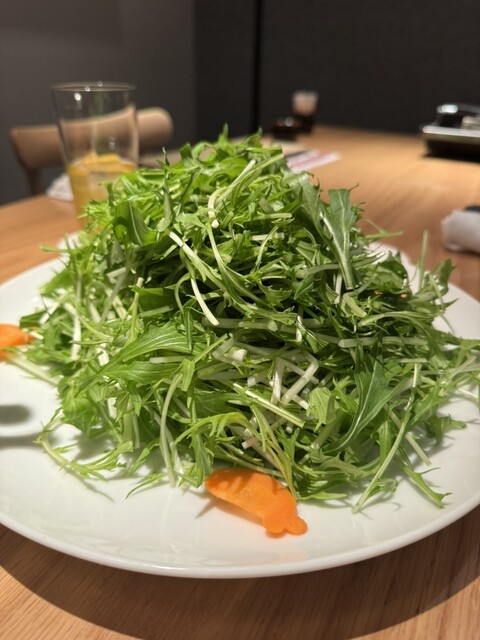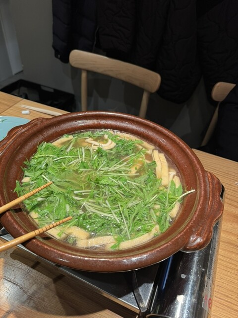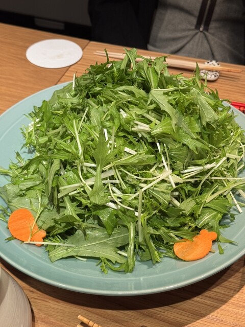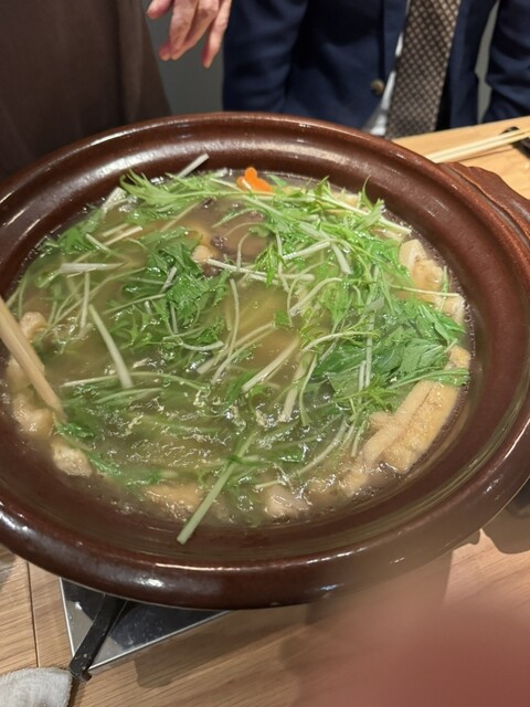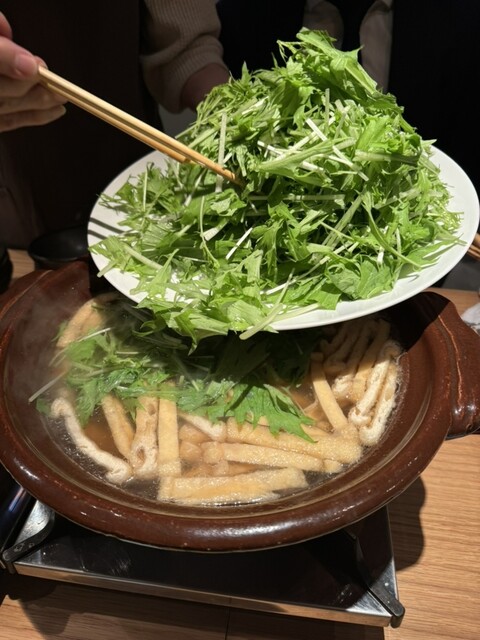 鯨、たっぷりの油揚げと野菜に火が通ると、そこに大量の水菜をドバッと入れて完成。