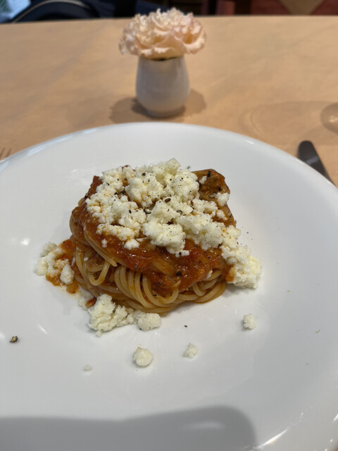 細めのパスタが使われている。やや甘みのある美味しいトマトソースでした。