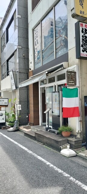 外観は白いガラス扉にグレーのオーニングでイタリア国旗が目印で、気軽に立ち寄れるカジュアルさが◎